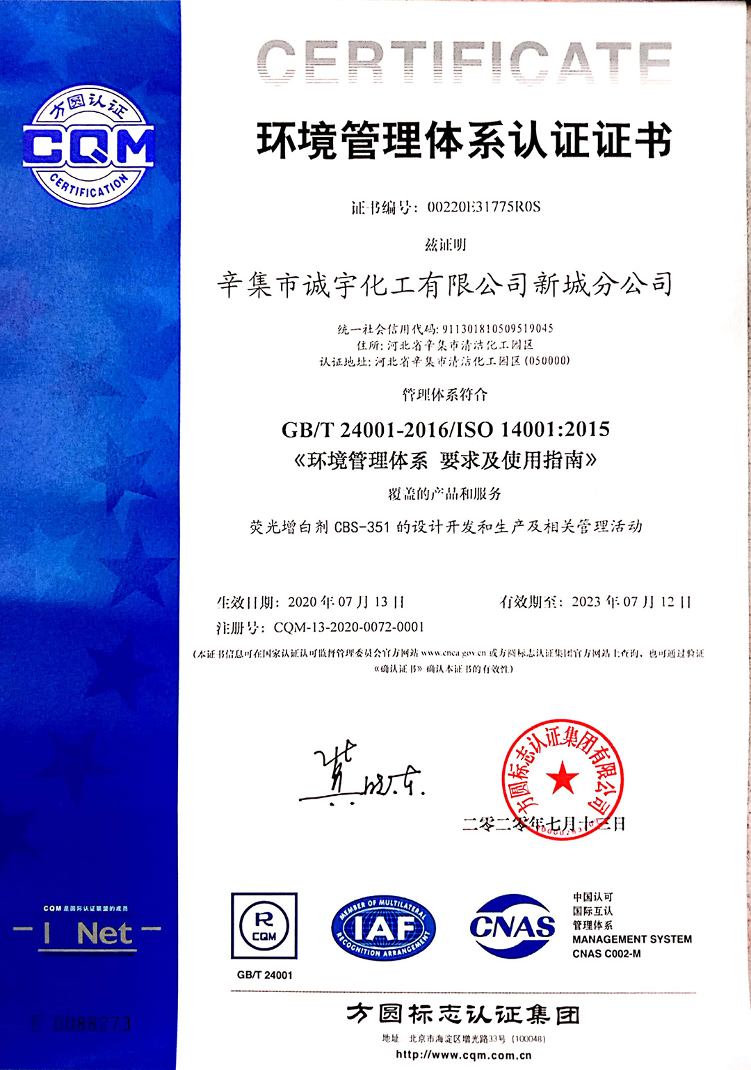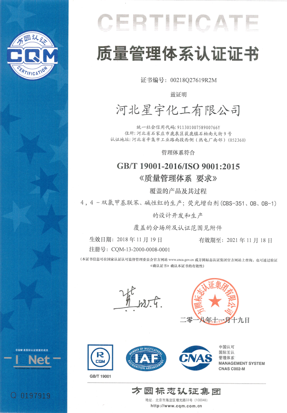 2001年,堿性紅6GDN、堿性紅1:1及堿性紫11:1產(chǎn)品項目獲“2001年度省科技廳科技成果完成者”證書,