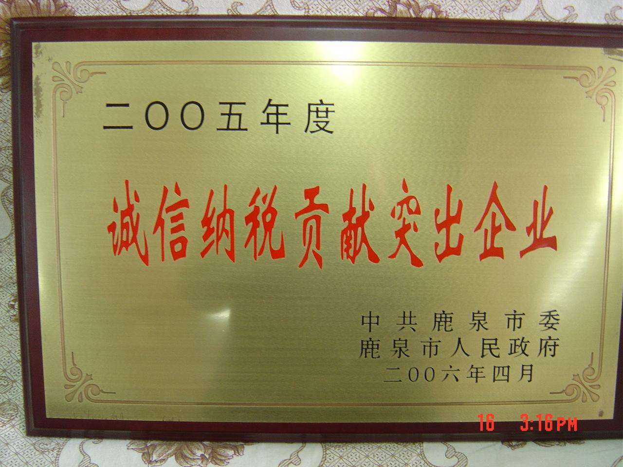 2006年、2007年,被鹿泉市委、市政府評為“誠信納稅貢獻突出單位”。